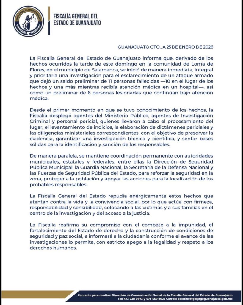 La Fiscalía General del Estado de Guanajuato informó que se inició una investigación inmediata por un ataque armado ocurrido en la comunidad de Loma de Flores, en el municipio de Salamanca, que dejó un saldo preliminar de 11 personas fallecidas y 6 personas lesionadas.