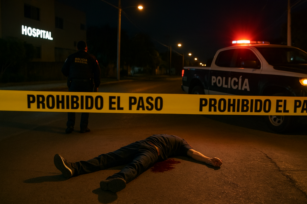 Pénjamo, Gto.- La noche de este domingo 7 de diciembre se registró un hecho violento en la avenida Insurgentes, prácticamente frente al Hospital Arboledas, donde un hombre fue localizado sin vida tras ser atacado a balazos. El reporte al sistema de emergencias alertó a las autoridades alrededor de las 19:00 horas, movilizando inmediatamente a cuerpos de seguridad y atención médica.