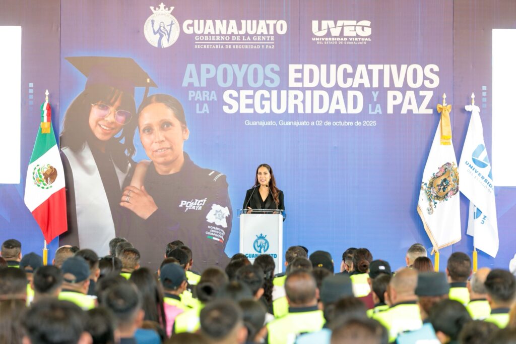 Guanajuato, Gto., 2 de octubre de 2025. – La gobernadora Libia Dennise García Muñoz Ledo anunció la puesta en marcha de apoyos educativos dirigidos a elementos de la Secretaría de Seguridad y Paz, así como a sus hijas e hijos, con el objetivo de fortalecer su desarrollo académico y personal.