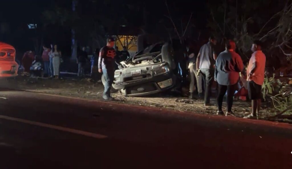 Pénjamo, Gto. — La noche de este sábado se registró un aparatoso accidente automovilístico sobre la carretera que conduce de Pénjamo hacia La Estación, luego de que una camioneta perdiera el control, saliera del camino y terminara completamente volcada tras derribar varios árboles.
