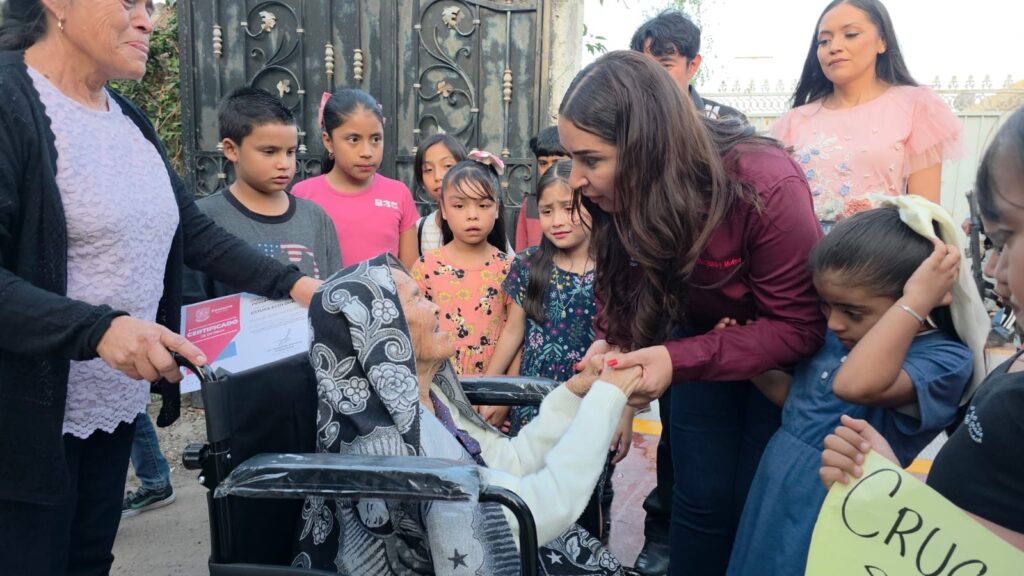 Pénjamo, Gto.– Doña Juanita, vecina de la comunidad Cruces de Rojas y quien recientemente cumplió 100 años, hoy pudo ver hecho realidad uno de sus mayores anhelos: salir de su casa en silla de ruedas por una calle completamente renovada. El sueño de esta centenaria mujer simboliza el impacto que tienen las obras que el Gobierno Municipal de Pénjamo, encabezado por la presidenta Yozajamby Molina, realiza en favor de la población.