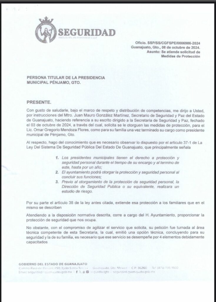 ¿Qué fantasmas persiguen a Omar Gregorio Mendoza Flores que lo obligan a vivir escoltado? ¿Qué pactos incumplió o con quiénes quedó mal, que aún necesita protección permanente? ¿Por qué los ciudadanos de Pénjamo, que viven con miedo a la delincuencia, deben costear la tranquilidad de quien ya no les gobierna? ¿Y dónde quedó el jefe de seguridad desaparecido durante su administración, un caso jamás esclarecido?