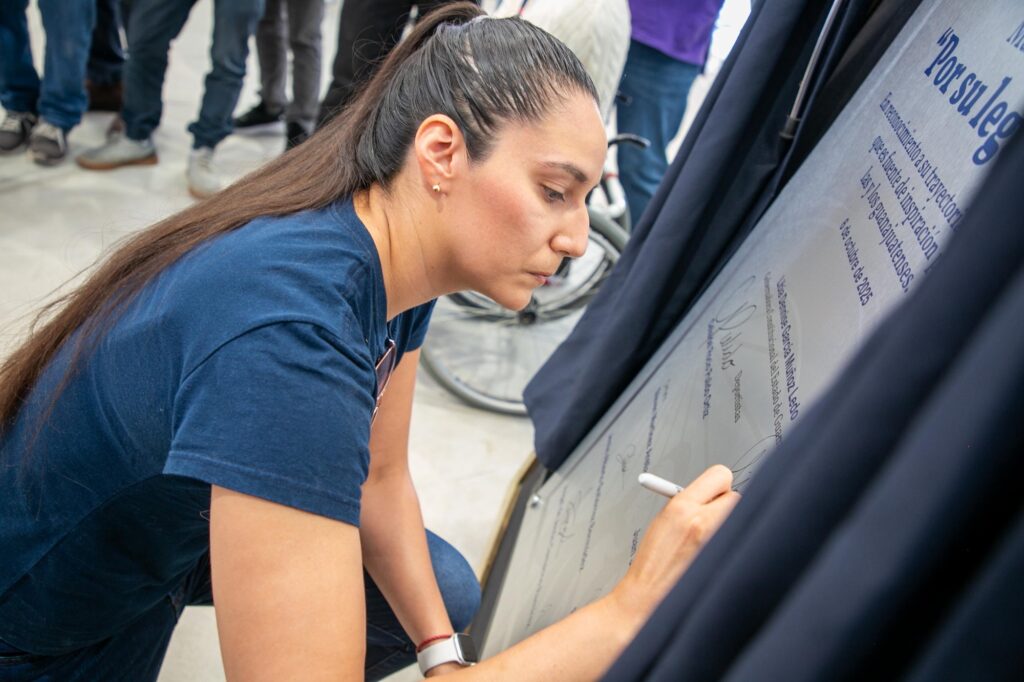 Como parte del evento, la Gobernadora firmó una placa conmemorativa del mural “Por su Legado”, ubicado en el pasillo principal del Macro Centro Deportivo, en homenaje a los atletas que han dejado huella en la historia deportiva de Guanajuato.