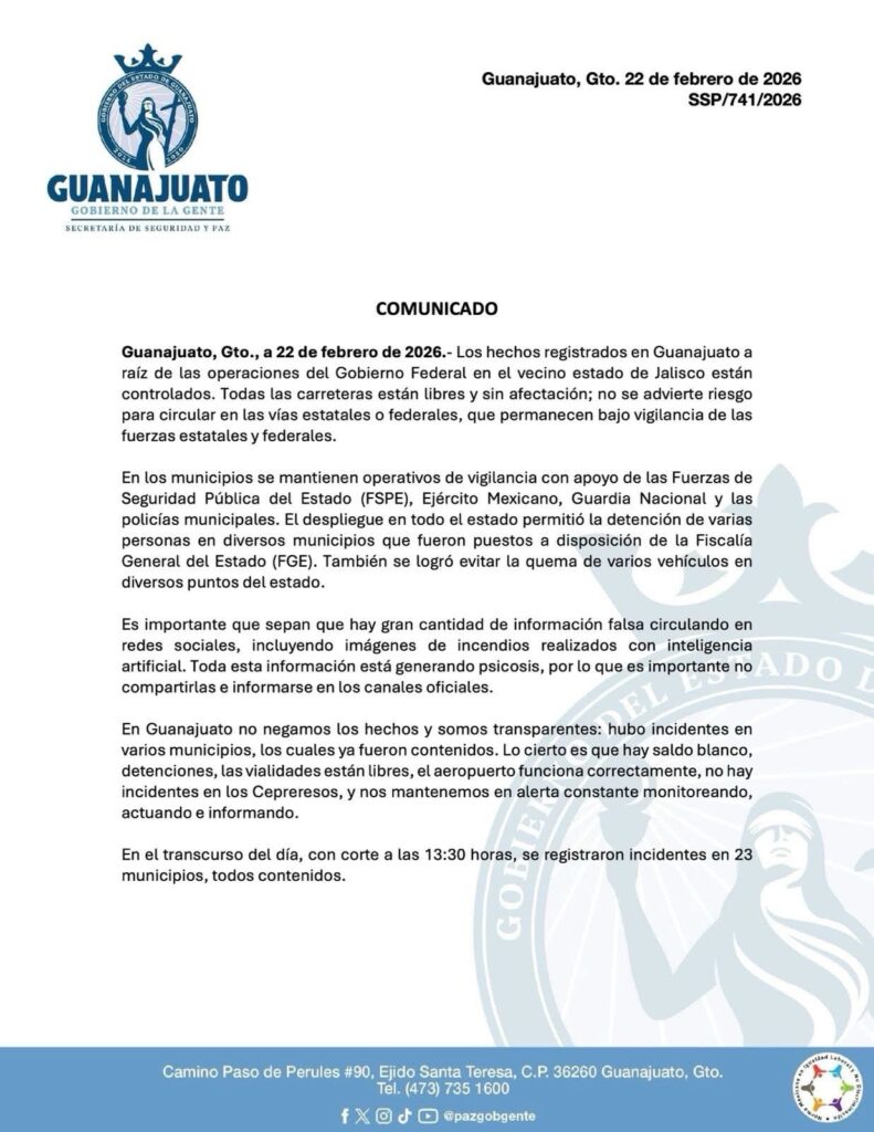 Guanajuato, Gto., 22 de febrero de 2026. — El Gobierno del Estado de Guanajuato, a través de la Secretaría de Seguridad y Paz, informó que los hechos registrados en Guanajuato a raíz de las operaciones del Gobierno Federal en el vecino estado de Jalisco se encuentran controlados.