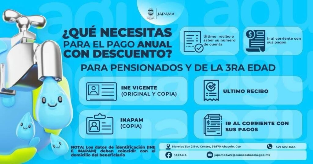 Abasolo, Guanajuato.– La Junta de Agua Potable y Alcantarillado Municipal de Abasolo (JAPAMA) dio a conocer los requisitos necesarios para que pensionados y personas de la tercera edad puedan acceder al pago anual con descuento en el servicio de agua potable.