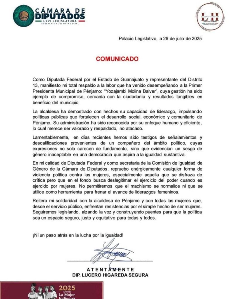 Cómo diputada federal por el estado de Guanajuato y representante del distrito 13, manifiesto mi total respaldo a la labor que ha venido desempeñando a la primera presidenta municipal de Pénjamo, Yozajamby Molina Balver, cuya gestión ha sido ejemplo de compromiso, cercanía con la ciudadanía y resultados tangibles en beneficio del municipio.
