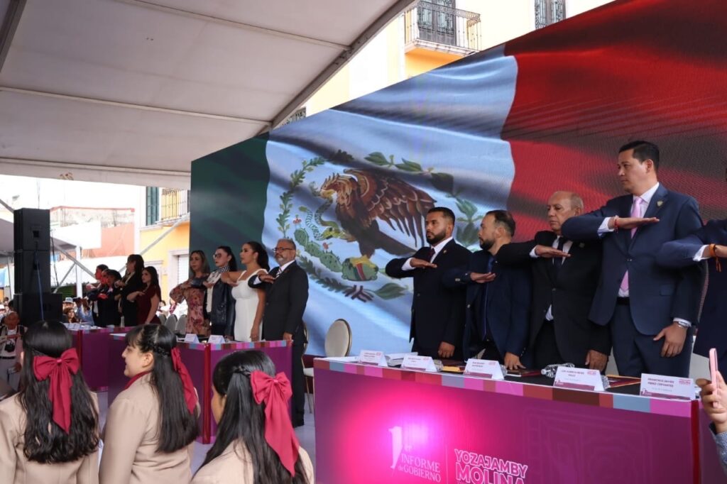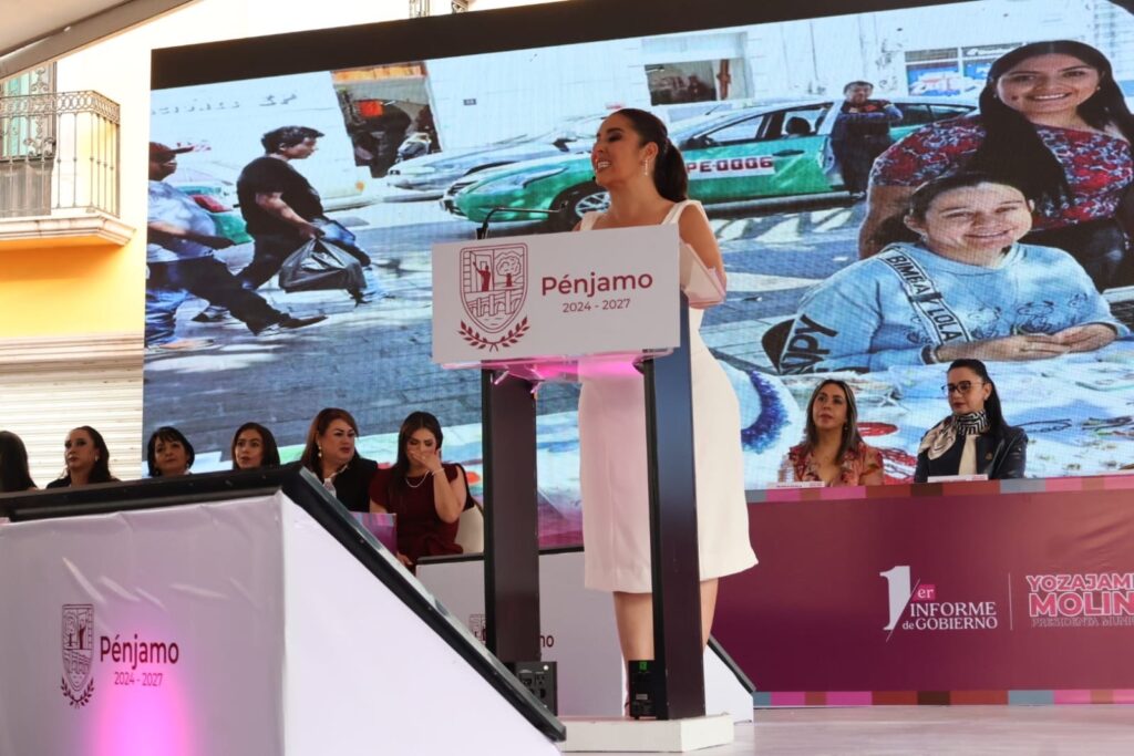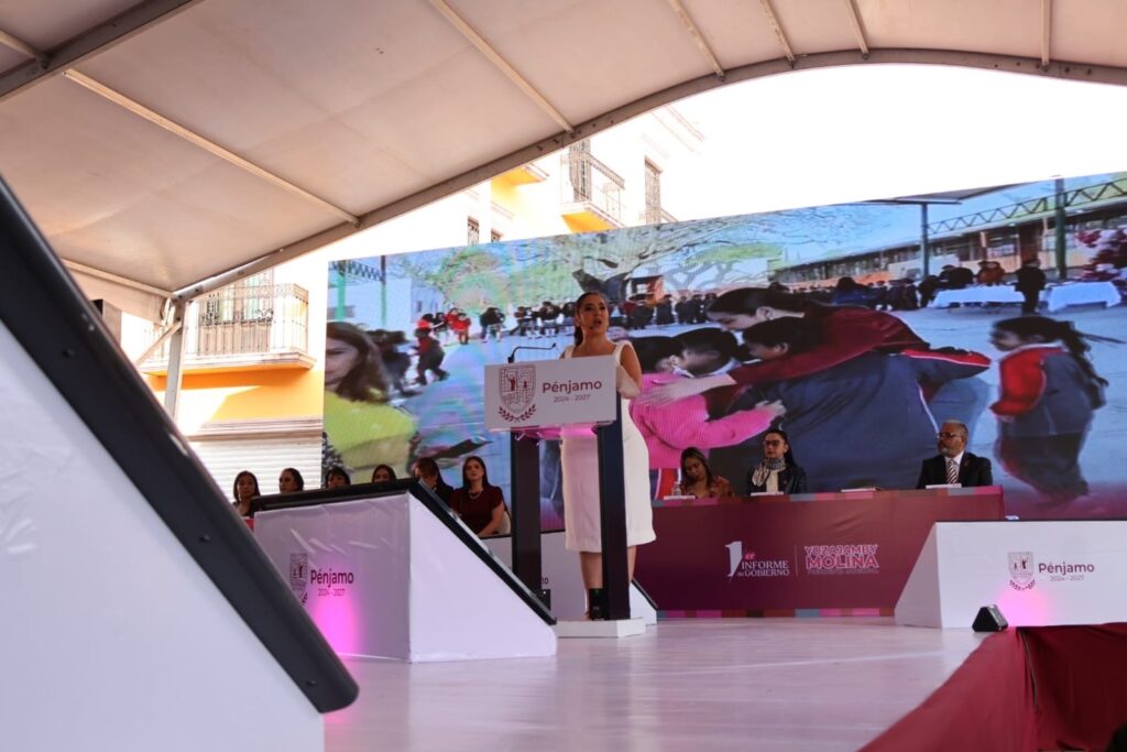 Pénjamo, Gto. – Ante un lleno total en el Jardín Ana María Gallaga y con la asistencia de más de 3 mil ciudadanos, la presidenta municipal de Pénjamo, Yozajamby Molina, rindió este jueves su Primer Informe de Gobierno, acompañada por integrantes del Ayuntamiento 2024-2027.