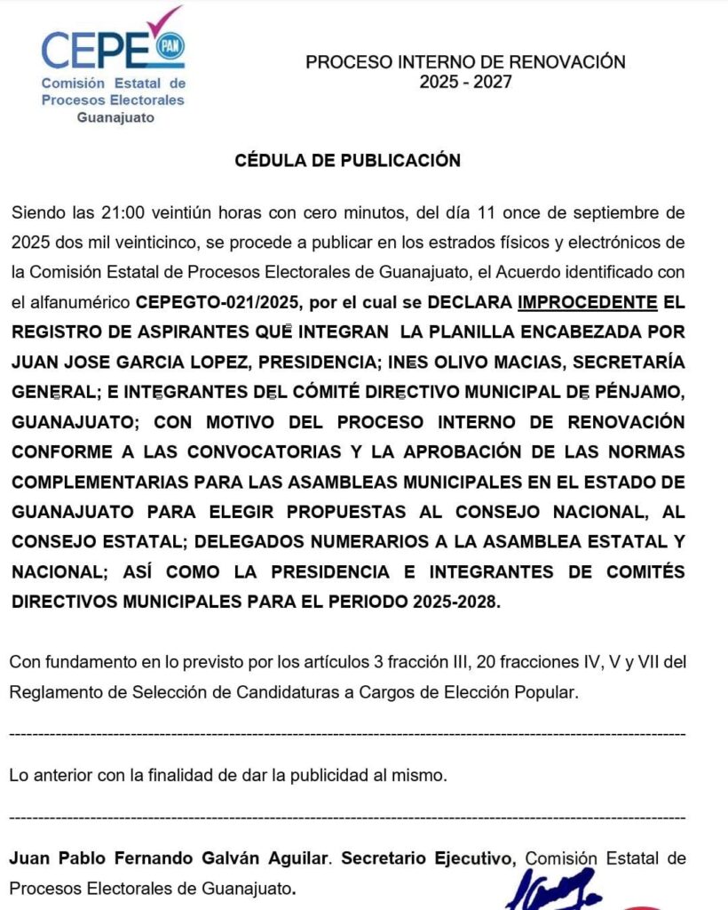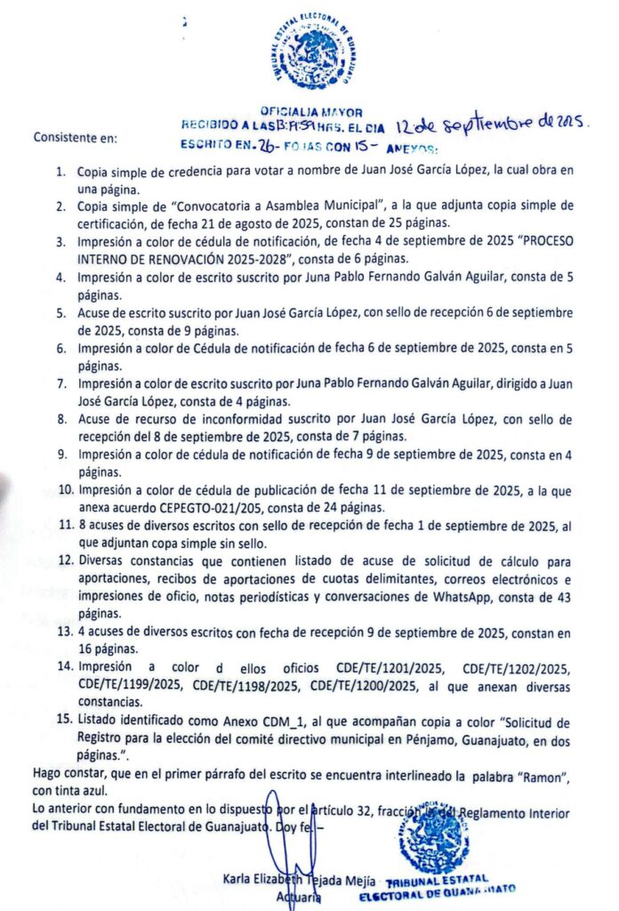 Pénjamo, Gto., 13 de septiembre de 2025. – Integrantes de la planilla Militantes Unidos de Pénjamo informaron que presentaron el pasado 12 de septiembre un Juicio para la Protección de los Derechos Político–Electorales del Ciudadano (JDC) ante el Tribunal Estatal Electoral de Guanajuato, en contra del acuerdo emitido por la Comisión Estatal de Procesos Electorales (CEPE), que declaró improcedente su participación en el proceso interno del Partido Acción Nacional (PAN).