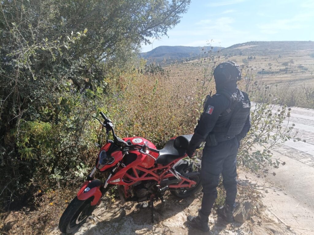 Además, se informó la recuperación de una motocicleta con reporte de robo vigente, localizada sobre la carretera estatal, a la altura del kilómetro 11+500, cerca de la desviación al Zarco.
