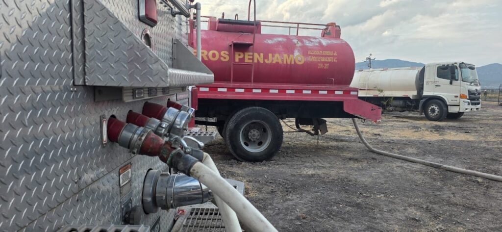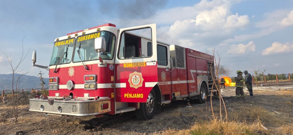 Pénjamo. Gto.- Luego de haber permanecido fuera de operación y ser utilizada únicamente en desfiles, el camión contraincendio donado a Bomberos finalmente se encuentra al servicio activo de la población y participó este lunes en la extinción del fuego provocado para la quema controlada de gas en un ducto dañado, ubicado a un costado de la carretera federal Pénjamo–Abasolo.
